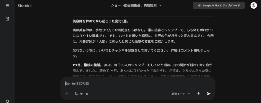 Geminiと対話しながら台本の大枠を作っていくのがポイントです。