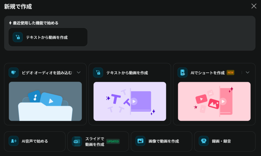 AI機能を搭載しており、テキストから自動で動画を生成してくれるため、編集スキルがなくても本格的な動画が作れます。