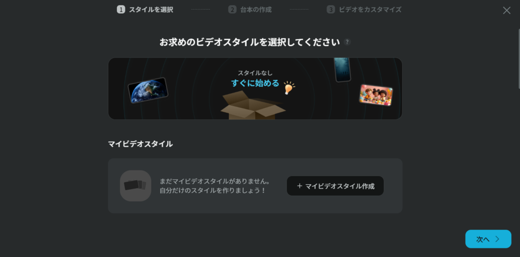 Vrewを起動したら「テキストから動画を作成」を選択し、動画のスタイル(ビジネス系、エンタメ系など)を選びます。