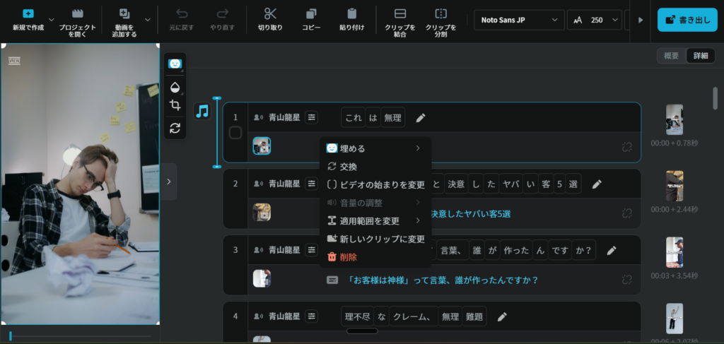 この段階ではまだ完成形ではありませんが、わずか数分で動画の骨組みが出来上がるため、制作スピードが格段に上がります。
