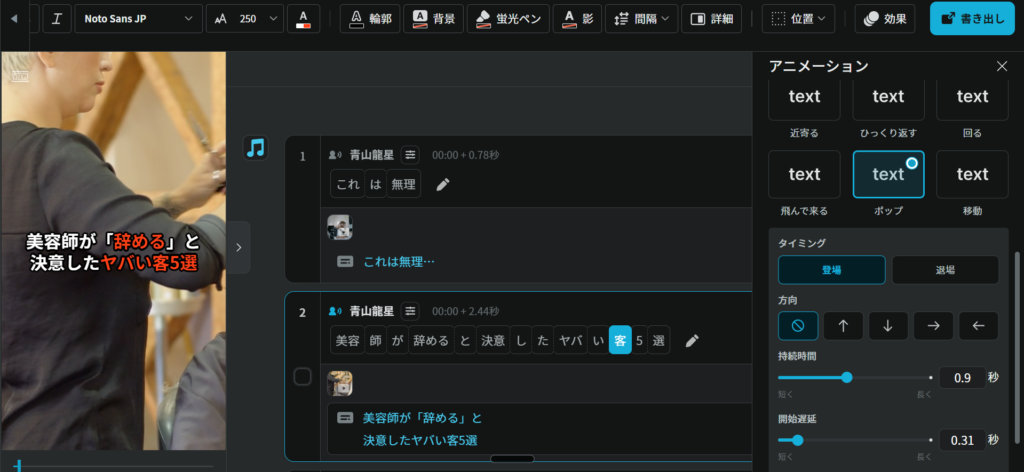 次にテロップのアニメーション効果を追加すると、視聴者の目を引きやすくなります。